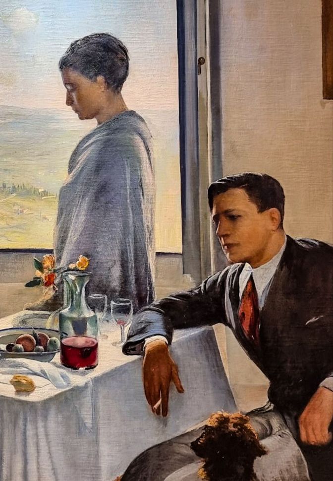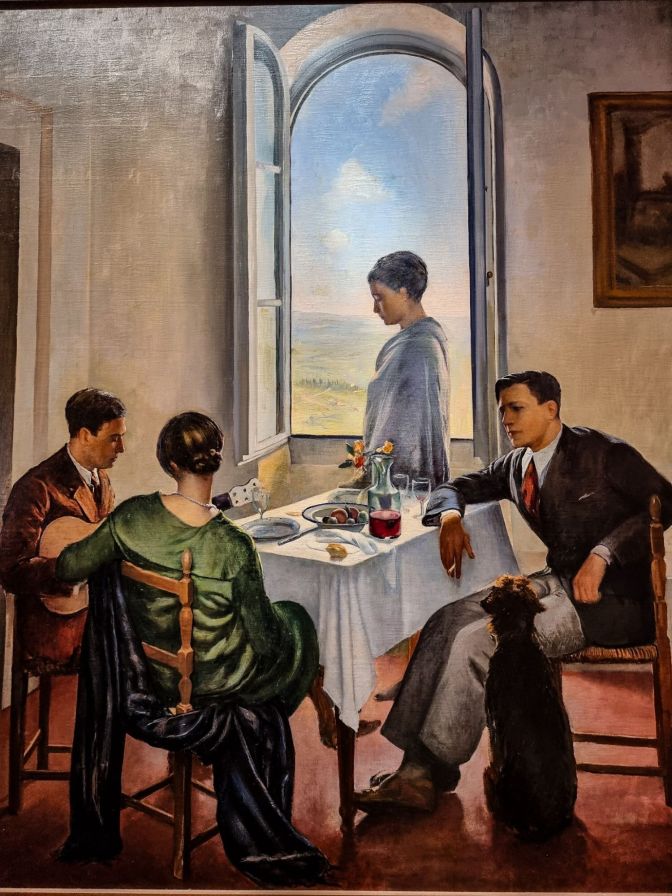 By the 20th century, one could provide evidence of drinking wine in a painting without worrying about a vengeful friar. Notice the small residue of wine sediment sitting in the bottom of the artist’s empty glass. Here, Baccio Bacci has painted a self-portrait of himself seated at the table smoking. Nobody looks particularly optimistic. There was no Savonarola, but at the time of this painting, there was someone else to worry about in Italy. A guy named Benito Mussolini.