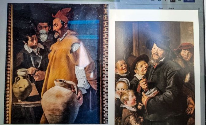 By the 1600’s, secular art had fully returned to southern Europe. While the Flemish and Dutch were by now in raucous tavern and drunken revelry mode, perhaps in Velazquez’s The Waterseller of Seville we see that in Spain, a continued temperance still existed. Or perhaps I have cherry-picked one painting to fit that idea. Here, the waterseller gives water to his two pupils. Nobody in the painting seems particularly thrilled to be in the water business. Meanwhile, in the Netherlands in the same time period of this painting, Frans Hals produced the The Rommel-Pot Player1. Alcohol is not present in the painting, but you know darn well there is a tipple or two just out of frame. They weren’t all born with those rosy cheeks.