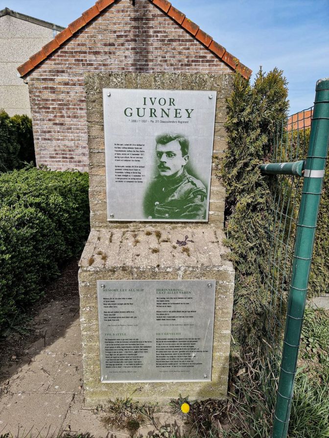 On this spot in September 1917, Gurney, an English poet, was the victim of a German mustard gas attack. Of the four poets mentioned in this post, he was the only one to survive the war. Gurney is listed among the Great War Poets in Westminster Abbey’s Poet’s Corner.