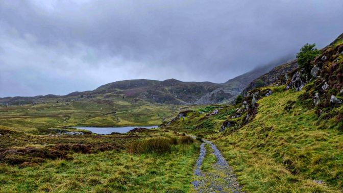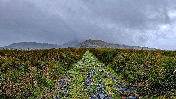 I stood looking up a long straight path heading towards a distant peak hidden beneath a shroud of ominous clouds. The path was strewn with bits of grey slate, a foreshadowing of a lost world just over the horizon. When it comes to hiking in Wales (same with Scotland), I have had to learn to roll with the weather. Staring into a distant abyss of clouds has become a familiar experience. In return, however, the clouds offer their own rewards. They create a cinematic atmospheric landscape; a feeling of stark isolation.