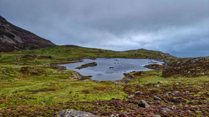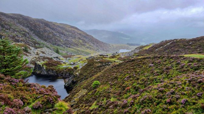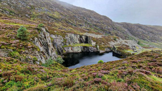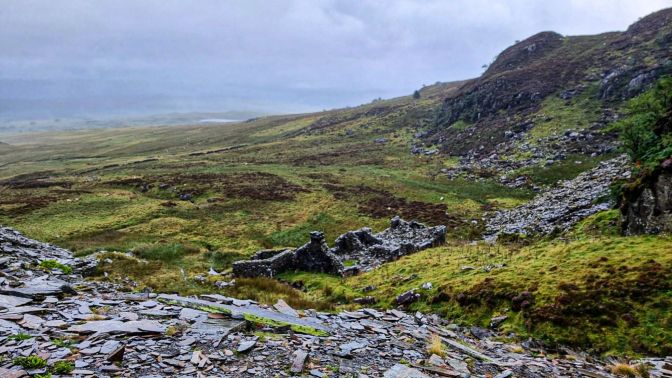 One of the things I love about hiking in this region is how the mountains intertwine with the region’s history. Remnants of the hard life of the local ancestry is scattered among the hills and valleys. The route from Pont Cyfyng is a great example. As you reach the first distant hill from the previous image, the path bends around and discovers a small mountain lake at the foot of a hidden ravine. One of the first things you notice is a huge mound of stone which doesn’t seem naturally occurring. This is a mound of slate scree from the mining activities that went on here in the late 1700’s and early 1800’s. Also in the vicinity are several structures which would have housed a rough community of slate miners. They stand in a haunting silence where once the sound of hammer against rock would have echoed off the hills.