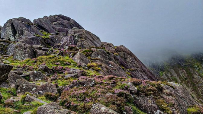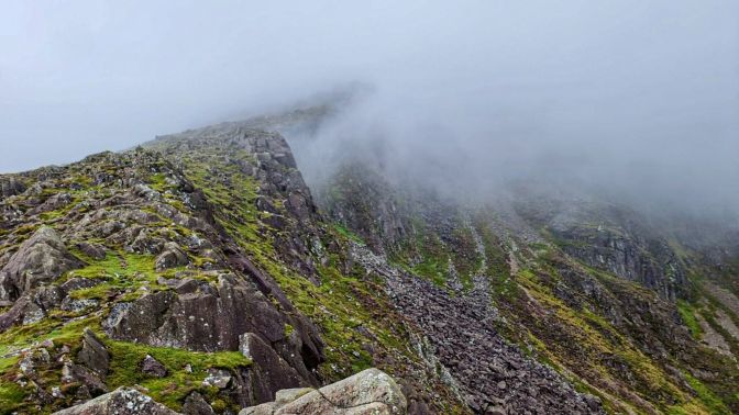 After the Daear Ddu Ridge, due to the cloud cover and wind, the scambling intensifies a little as you make the final push for the summit.