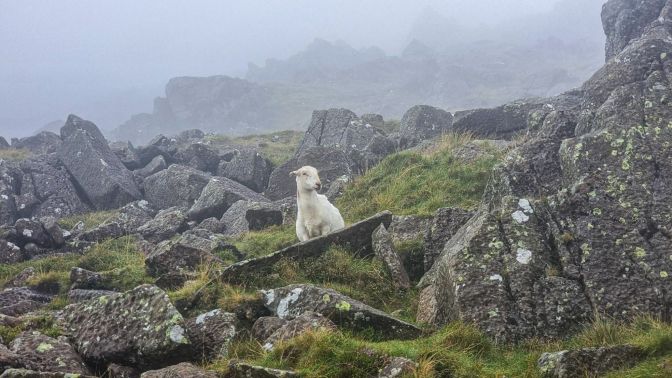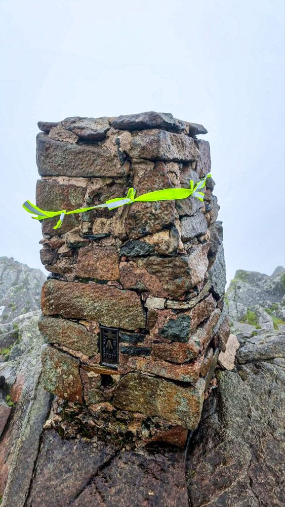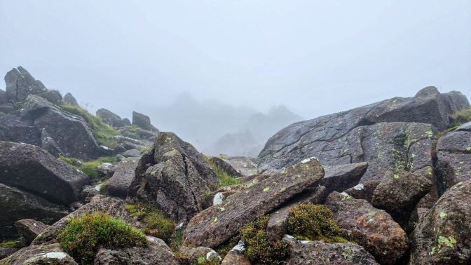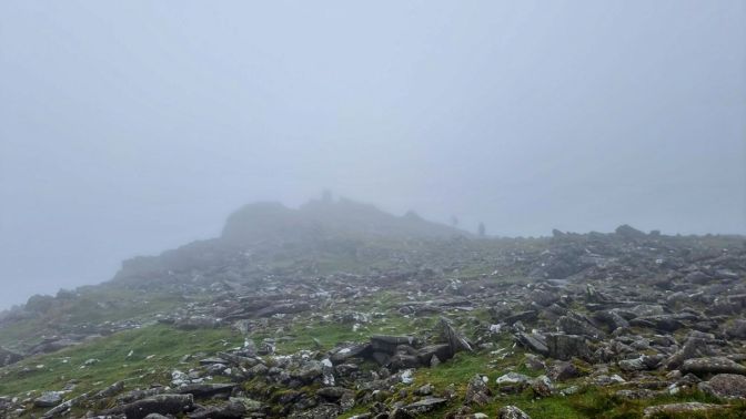 The peak was giving its best Yr Wyddfa impression by being completely engulfed in clouds. The wind was also quite harsh. There were a few other hikers up there, one bundled up looking like they were going to try and wait out the weather hoping to get a clear view. I didn’t have the patience for that, so I started the descent.