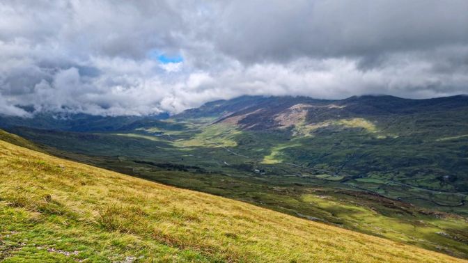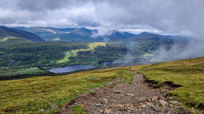 As the sun started to show itself during the descent, a trail runner that I had passed in the clouds earlier was now galloping back down the path. She looked back and hollered in her British accent ‘It looks better when they turn the lights on, dun’ it!‘ That’s true, I thought. Despite the “monotonous grass slopes”, the views were spectacular. But in Wales the lights never seem to work in the attic, I muttered under my breath. As the sun started to appear in more glory, the hairs stood up on the back of my neck as I contemplated what I would see behind me. What if I turned around to find a blue heavenly firmament sitting over the mountain top? The temptation was overwhelming, so I took a peek. Fortunately, the attic lights were still off. There’ll be no brilliant summit views for all the Instagrammers on my watch. Little did I realize that I would get a small taste of my own medicine over the next few hikes.