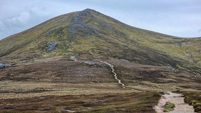 Up on the plateau, the chin of Bynack More appears with Bynack Beg on the right. As you approach, it becomes evident that the actual peak of Bynack More is not visible from the plateau. It will take a steep climb before you get far back enough to see the peak.