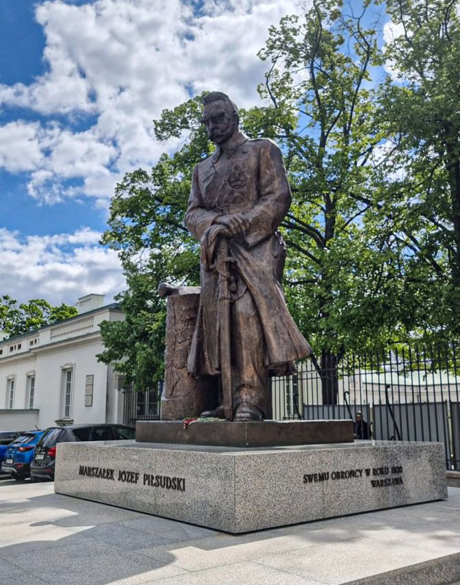 Next to the Royal Baths Park is the palace of the Polish President. Just in front of that is a statue of Pilsudski greatly emphasizing his characteristic flat top, unibrow and Kaizer-stache.