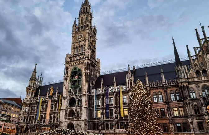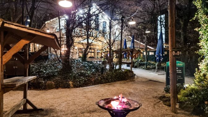 Saving this one for last because this became my favorite beerhall over the holidays. It sits a bit away from the old town, a few blocks west of the Hauptbahnhof, but it is well worth the walk. This massive, colorful beerhall resembles the Oktoberfest tent aesthetic even better than the Hofbräuhaus. The interior is a vast barrel-shaped hall with Bavarian crests decorating the ceiling. During the Christmas season, you can book a table in one of the private cottages out in the courtyard. Outside, they also keep a cozy fire going with a gluhwein stand for a charming respite from the overcrowded Christmas market in the old town.