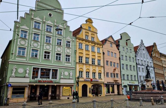 Coming north along the Maximilianstraße, you reach the start of the Christkindlmarkt festivities at the Moritzplatz and the colorful Weberhaus.