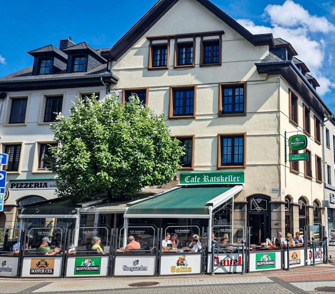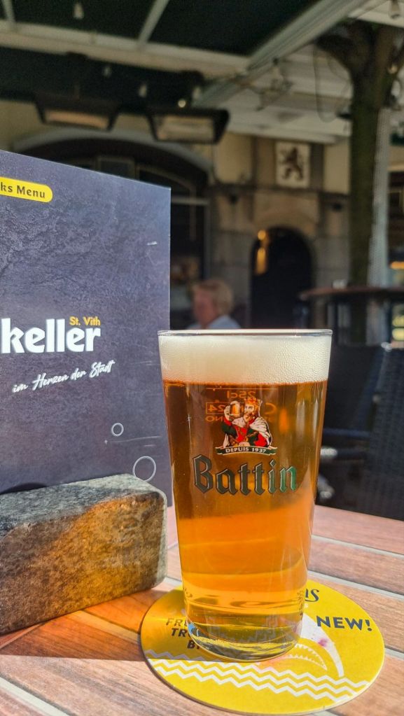 When you visit Bastogne, you get multiple war museums, a Sherman tank on McAuliffe Square, several memorial sites within an enjoyable walking distance and a cool beer culture centered around Bastogne’s status in the Battle of the Bulge lore. Sankt Vith has none of that. I saw nary a military-themed beer, and except for the handful of memorials and information panels already mentioned, you would hardly know the war ever came through here. As far as the beer culture, there is one pub worth mentioning in Sankt Vith, Cafe Ratskeller. Here you will not find an Airborne beer like in the pubs of Bastogne but will have to settle for the standard Luxembourgish beers like Battin and Bofferding. Nevertheless, it is a very nice place to sip a beer on a sunny day.