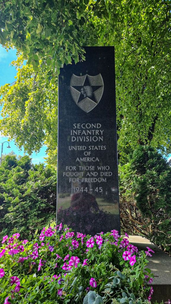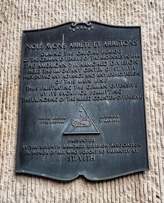 Today, Sankt Vith offers quiet reflection of those turbulent events. A memorial to the 2nd Infantry Division stands in the shade of a tree just north of the town center along a grassy divide. A plaque to the 7th Armored Division is placed rather subtly on the outside of a bank. I walked by it several times before noticing it. And south of the town center is the memorial to the 106th Infantry Division.