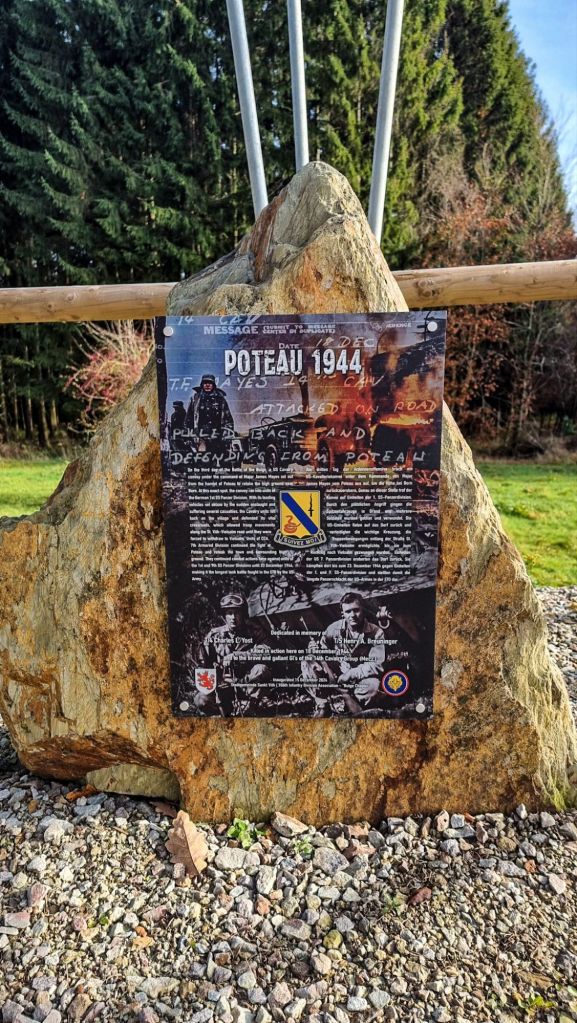 To get to the Poteau memorial, you have to walk along a road with no shoulder. On December 18, 1944, the 40th Tank Battalion of the 7th Armored Division engaged in a day long battle along this road. The Ardennen-Poteau ’44 Museum once stood at the top of this road but closed down in 2014.